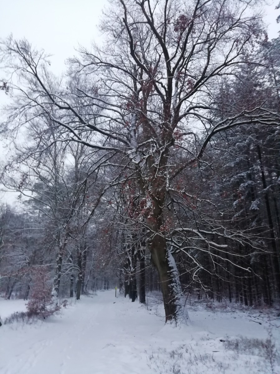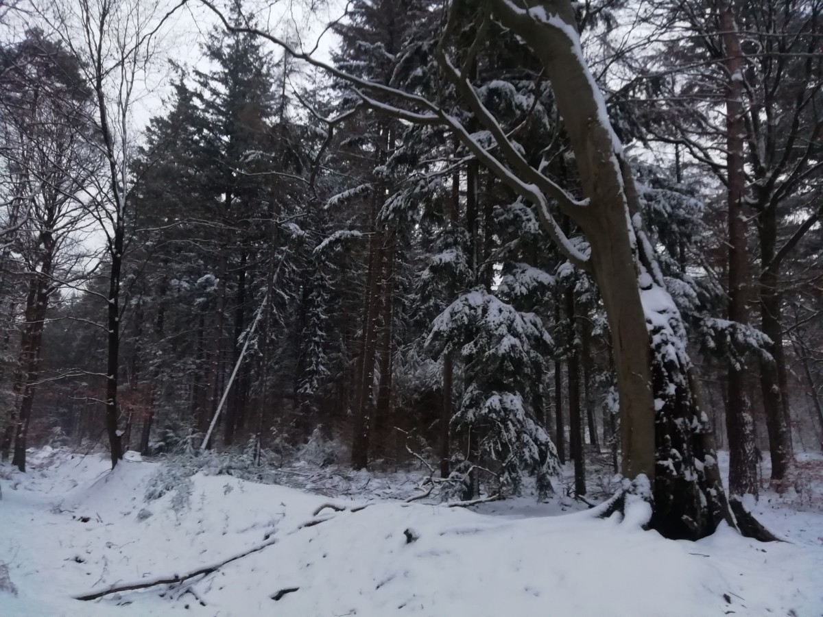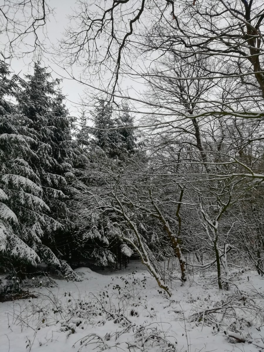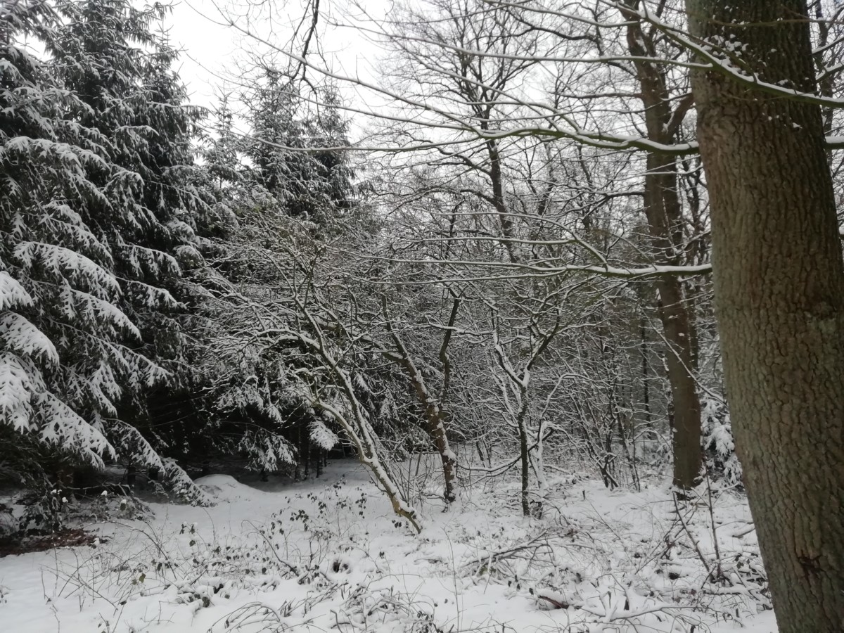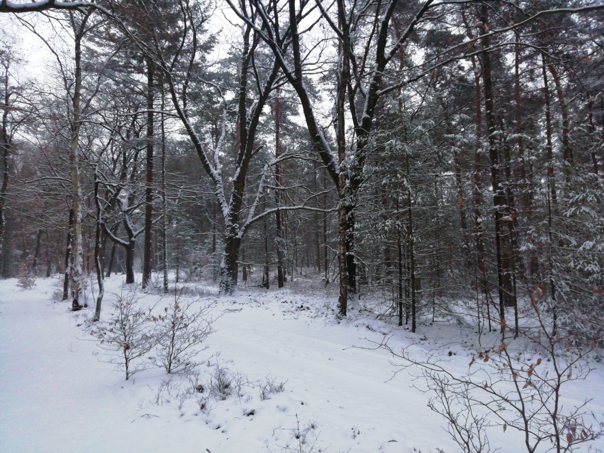 In het donker om kwart over zeven hebben we ons dik ingepakt, onze bergschoenen aangetrokken en zijn we de sneeuw ingestapt. Foto’s kun je dan nog niet maken maar we hadden plezier met het volgen van sporen die van herten en van vossen leken te zijn. Om kwart voor acht was het al zo goed als licht, veel eerder dan gebruikelijk wanneer ik op de fiets naar mijn werk rij. De sneeuw geeft een extra dimensie licht aan de ochtendschemering.